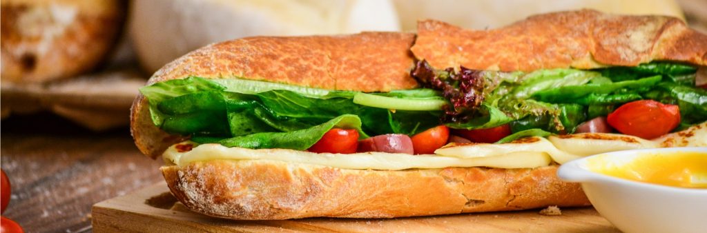 Jamón York, queso gouda, lechuga, mayonesa y mostaza.